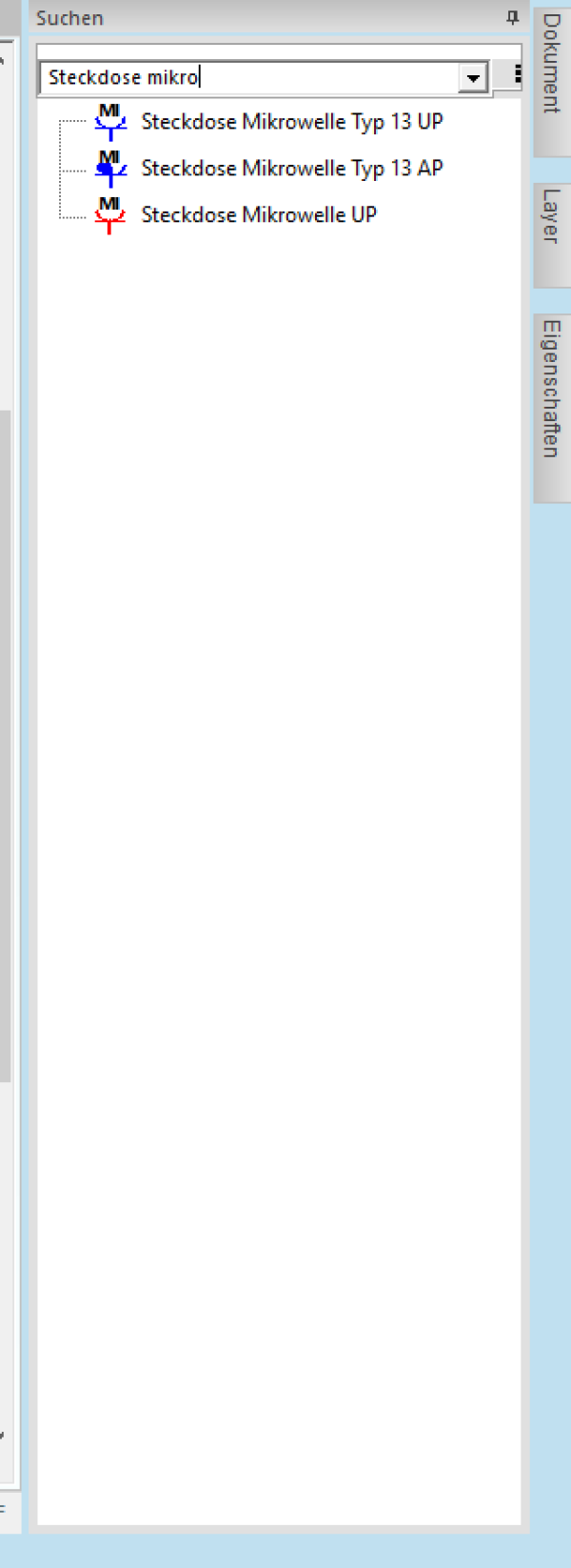Es wir Ihnen das Suchfenster eingeblendet. Tragen Sie jetzt Ihre Frage ein, z.B. Steckdose, Die Suchfunktione beginnt zu suchen, sobald mehr als drei Buschstaben eingetragen worden sind. Sie können die aufgelisteten Symbole und befehle wie bei jedem Werkzeugkasten benutzen.