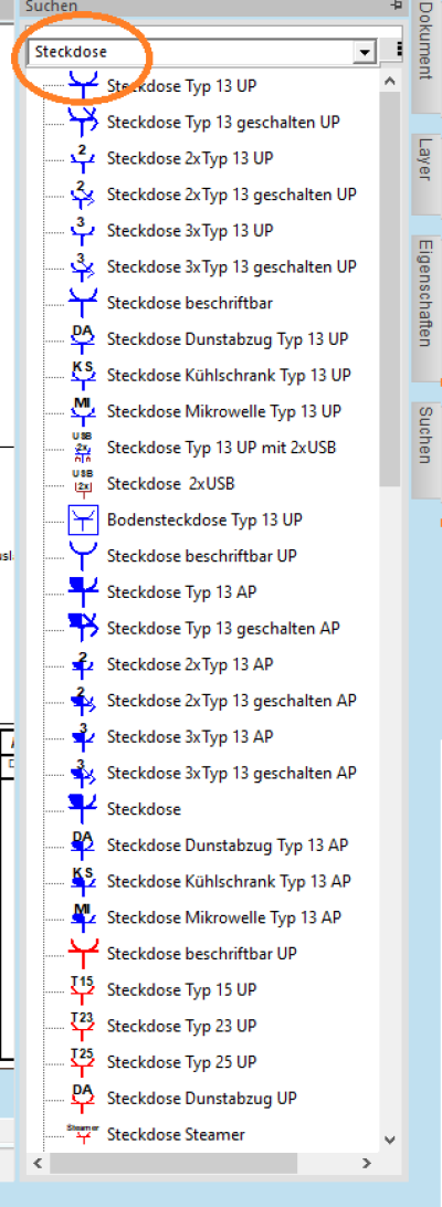 Es wir Ihnen das Suchfenster eingeblendet. Tragen Sie jetzt Ihre Frage ein, z.B. Steckdose, Die Suchfunktione beginnt zu suchen, sobald mehr als drei Buschstaben eingetragen worden sind. Sie können die aufgelisteten Symbole und befehle wie bei jedem Werkzeugkasten benutzen.